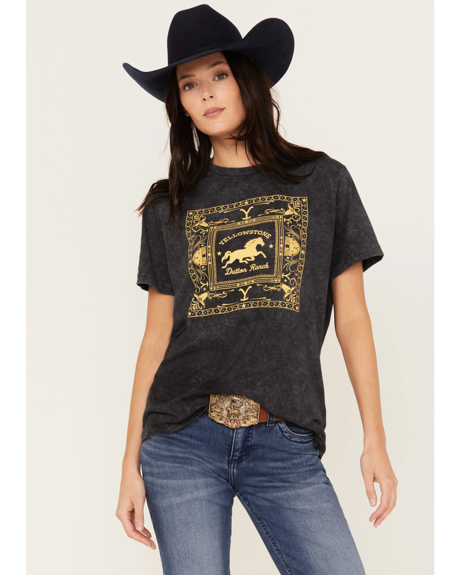 - Yellowstone themed western bandana print with “Yellowstone Dutton Ranch” graphic on front
