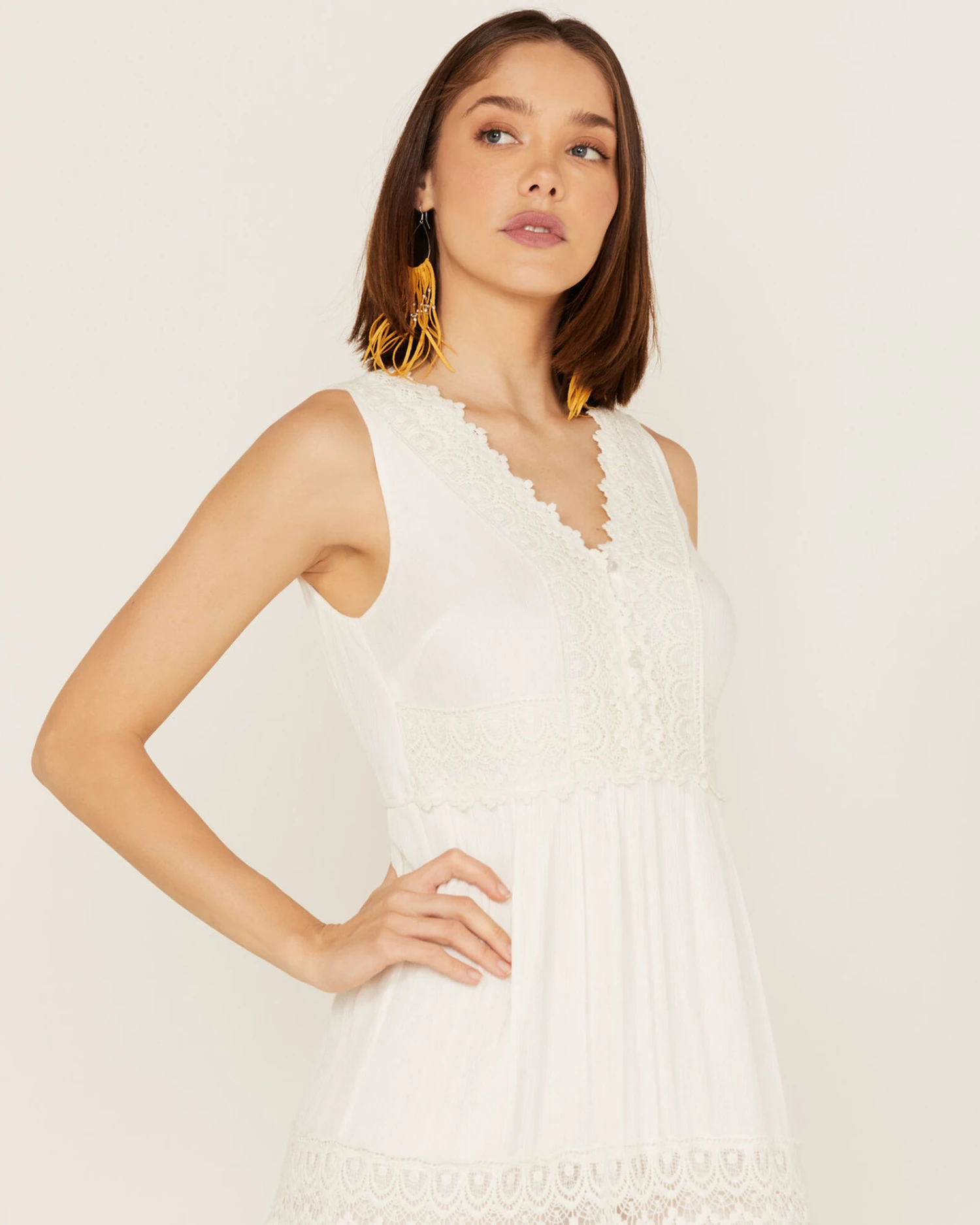 - Ivory crinkle material with lace panel overlay