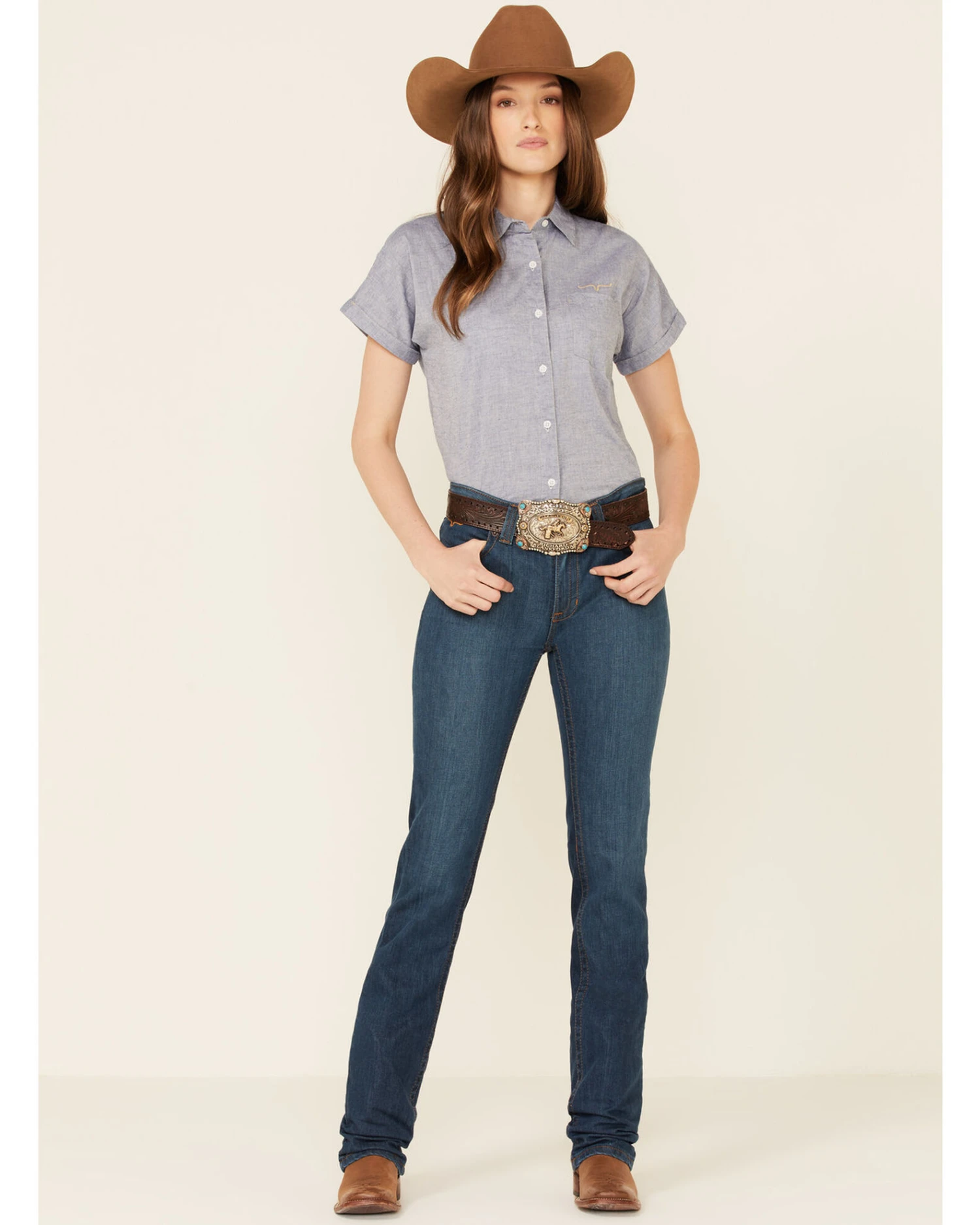 The Kimes Ranch Betty jean is made only with the best denim. These Betty 17 jeans have slimming lines creating the perfect fit. The tri-blend technology allows for fit and comfort while holding its shape. The ring spun denim also has greater tensile/tear strength in the fabric than the open end yarn found in other brands, therefore, giving it a long and lasting life. The Betty sits mid rise and is fitted in the upper thigh and knee. Tuck these boots in or wear them over your cowgirl boots. Either way you will look great and feel comfortable.