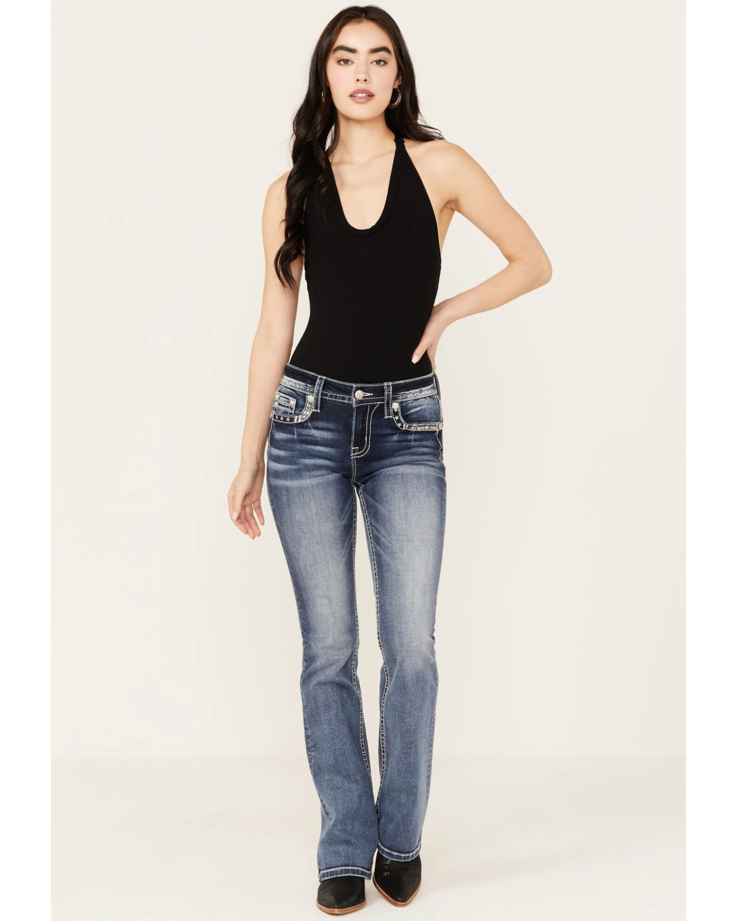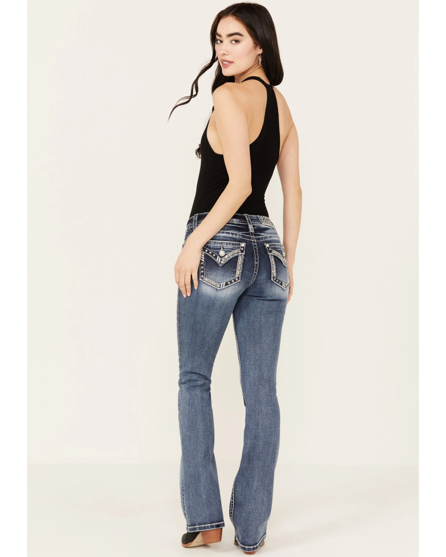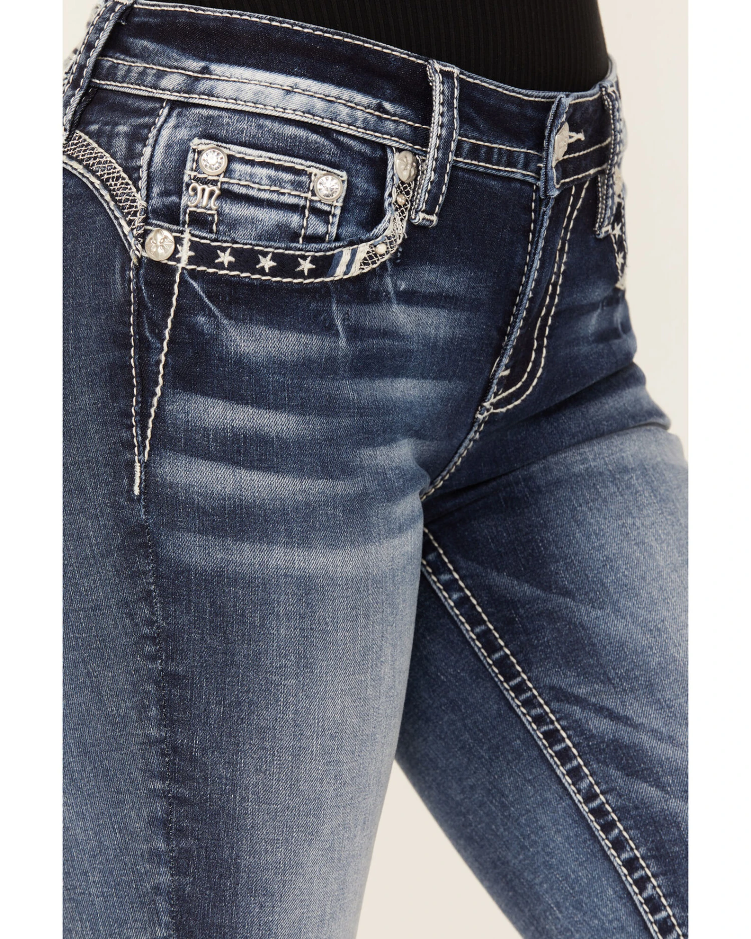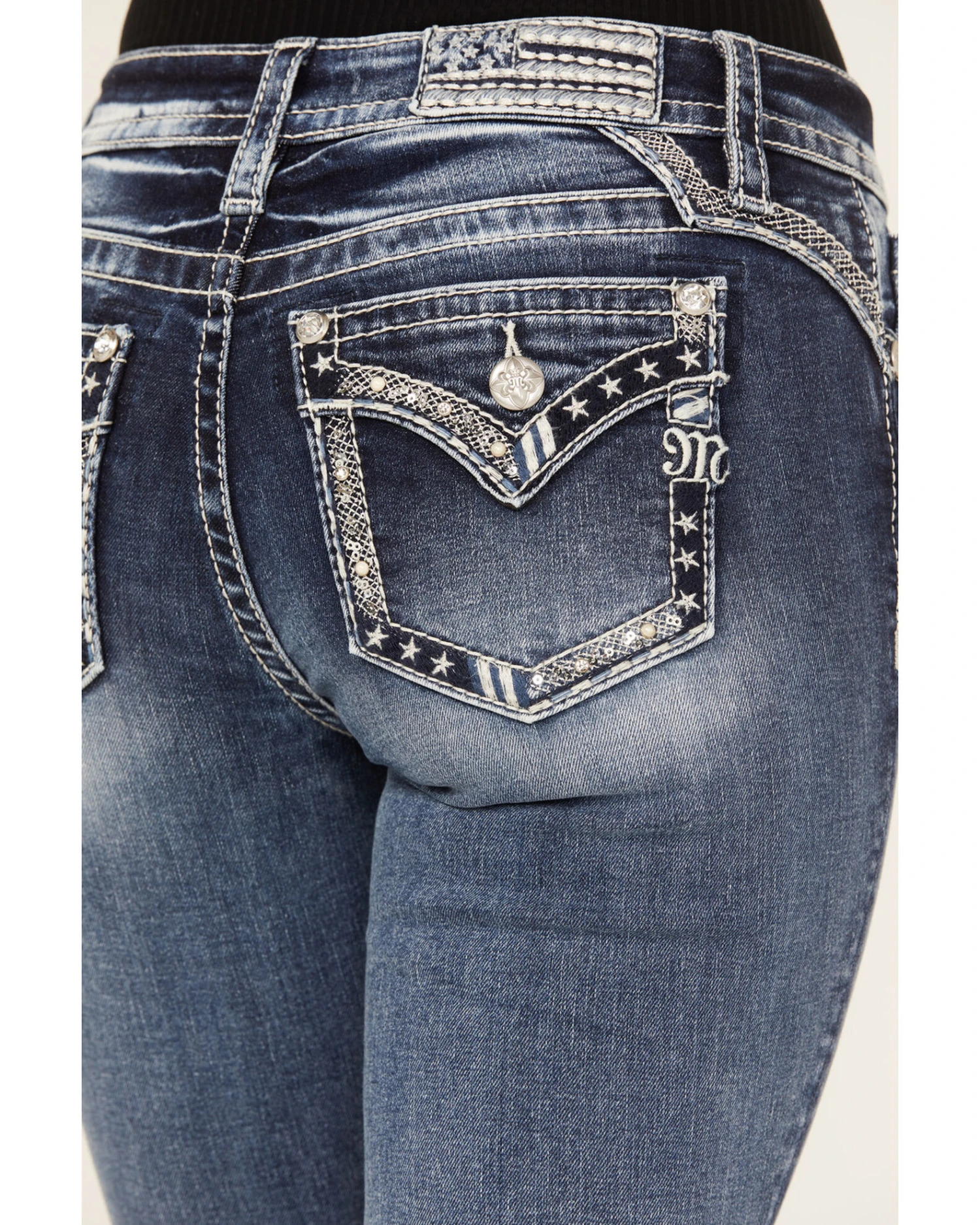 Miss Me Women’s Dark Wash Low Rise Tonal Americana Border Bootcut Jeans